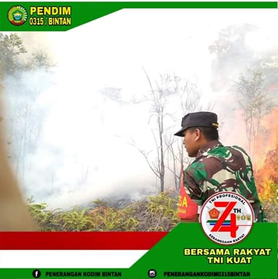 Babinsa Sei Enam Koramil 02/Bintim Kodim 0315/Bintan Serda Indra Yuriko ikut membantu pemadaman kebakaran hutan yang kembali melanda Kelurahan Sei Enam tepatnya di Kampung Baru RT 02 RW 04, Sei Enam Darat, Bintan, Minggu (25/8/2019).