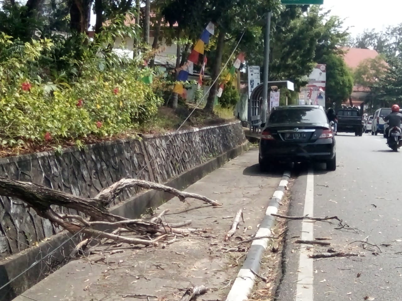 Saat berita ini diunggah, belum ada pihak-pihak terkait yang datang ke lokasi untuk membersihkan pohon tumbang tersebut dari trotoar.
