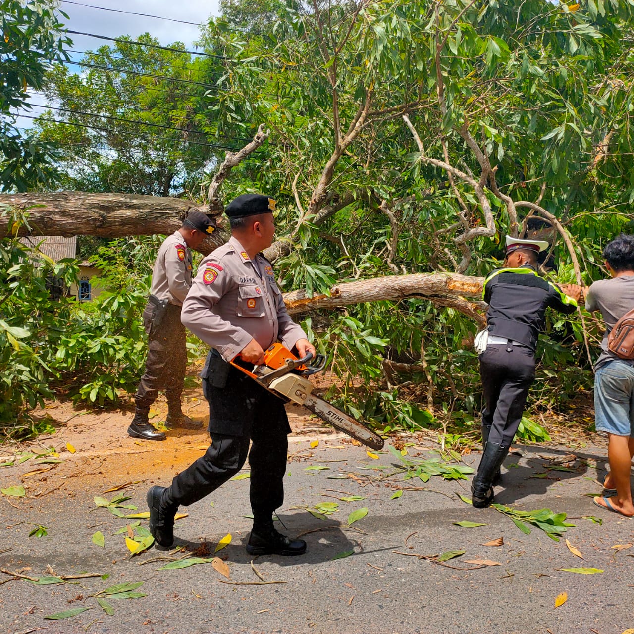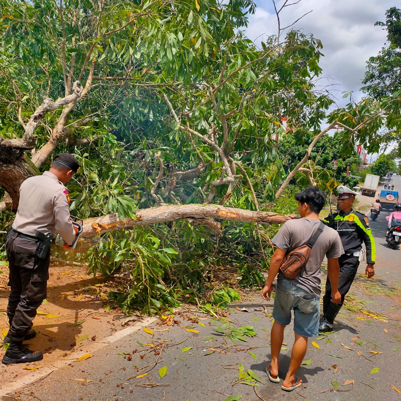 Pohon pun kemudian dipotong menjadi bagian-bagian kecil hingga mudah untuk disingkirkan / ditepikan. Sat Lantas Polres Tanjungpinang juga melaksanakan pengaturan sehingga arus lalu lintas kembali normal.