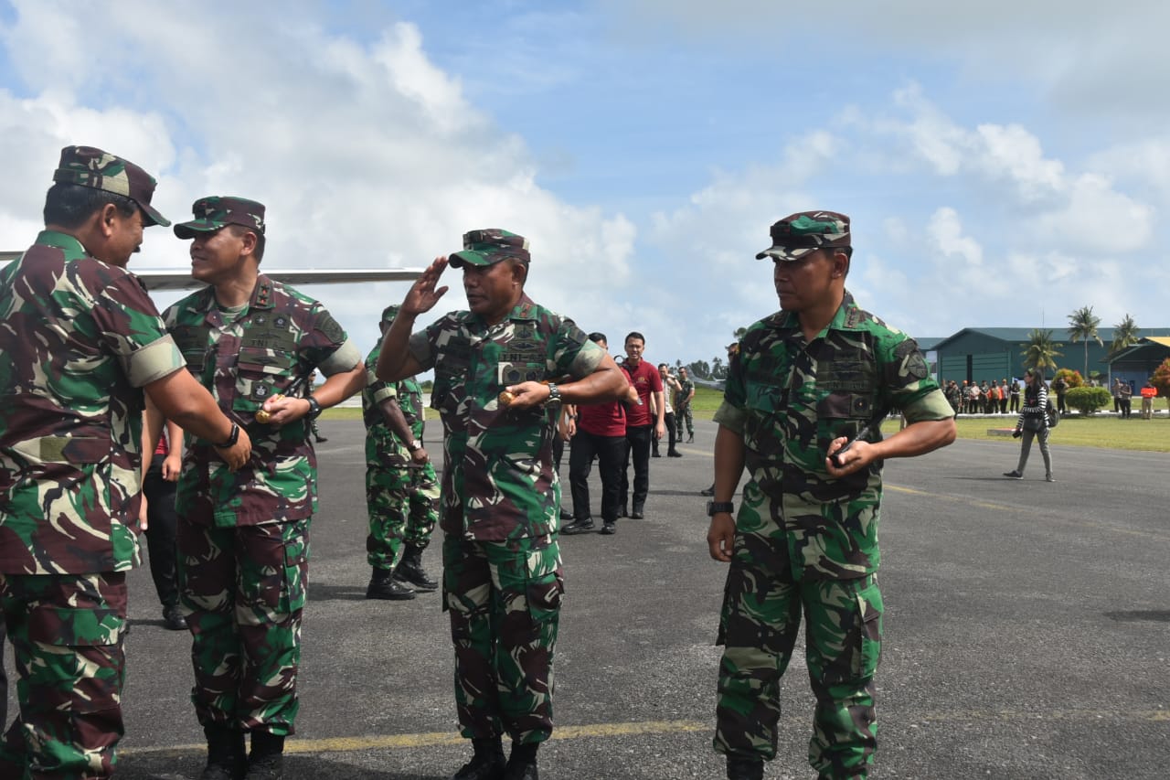 Danrem 033/WP Brigjen TNI Gabriel Lema S. Sos menyambut kunjungan Panglima TNI, Marsekal Hadi Tjahjanto, bersama Kapolri Jenderal Idham Azis di Natuna didampingi FKPD Prov Kepri dan Kab Natuna serta ratusan personel gabungan TNI-Polri, Kamis, (13/02/2020).