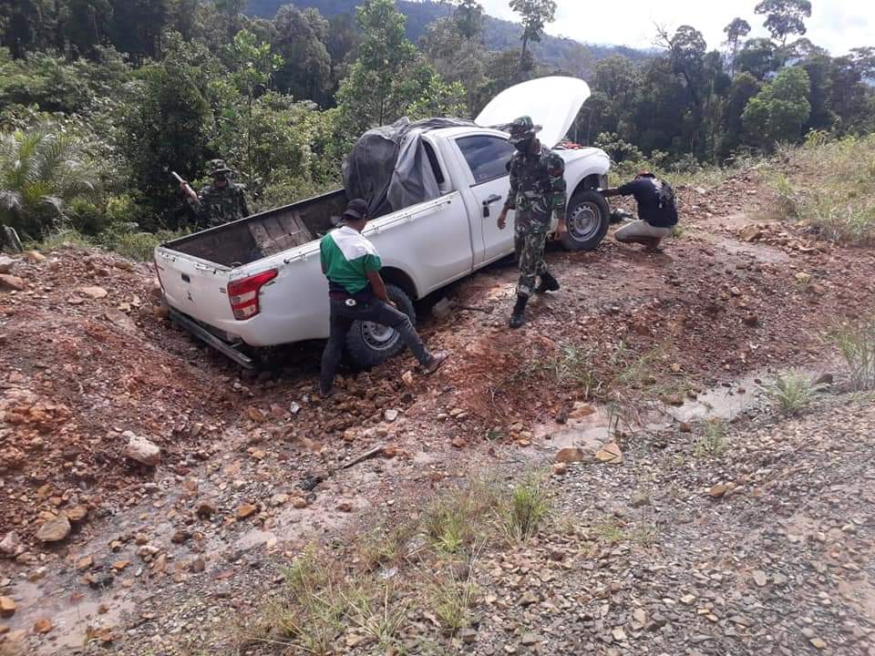 Anggota Satgas Pamtas RI-MLY Yonif 623/BWU mengevakuasi korban kecelakaan tunggal lintas di Desa Sekaduyan Taka, Kabupaten Nunukan, Kamis (18/6/2020).