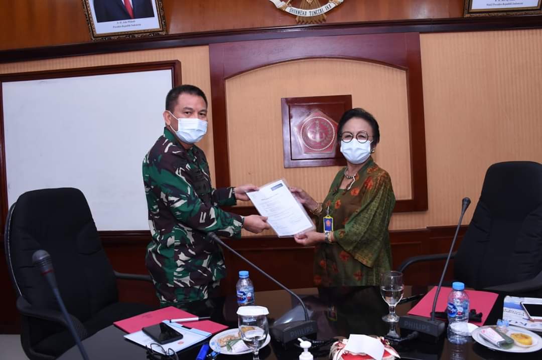 Mabes TNI melalui Aster Panglima TNI Mayjen TNI George Elnadus Supit, S.Sos. mewakili Panglima TNI Marsekal TNI Hadi Tjahjanto, S.I.P. menerima donasi 300.000 masker dari Yayasan Upaya Indonesia Damai (UID) dan PT. Gajah Tunggal, bertempat di Rupat Ster TNI Gd. B2 Lt.5 Mabes TNI Cilangkap, Jakarta Timur, Kamis (18/6/2020).