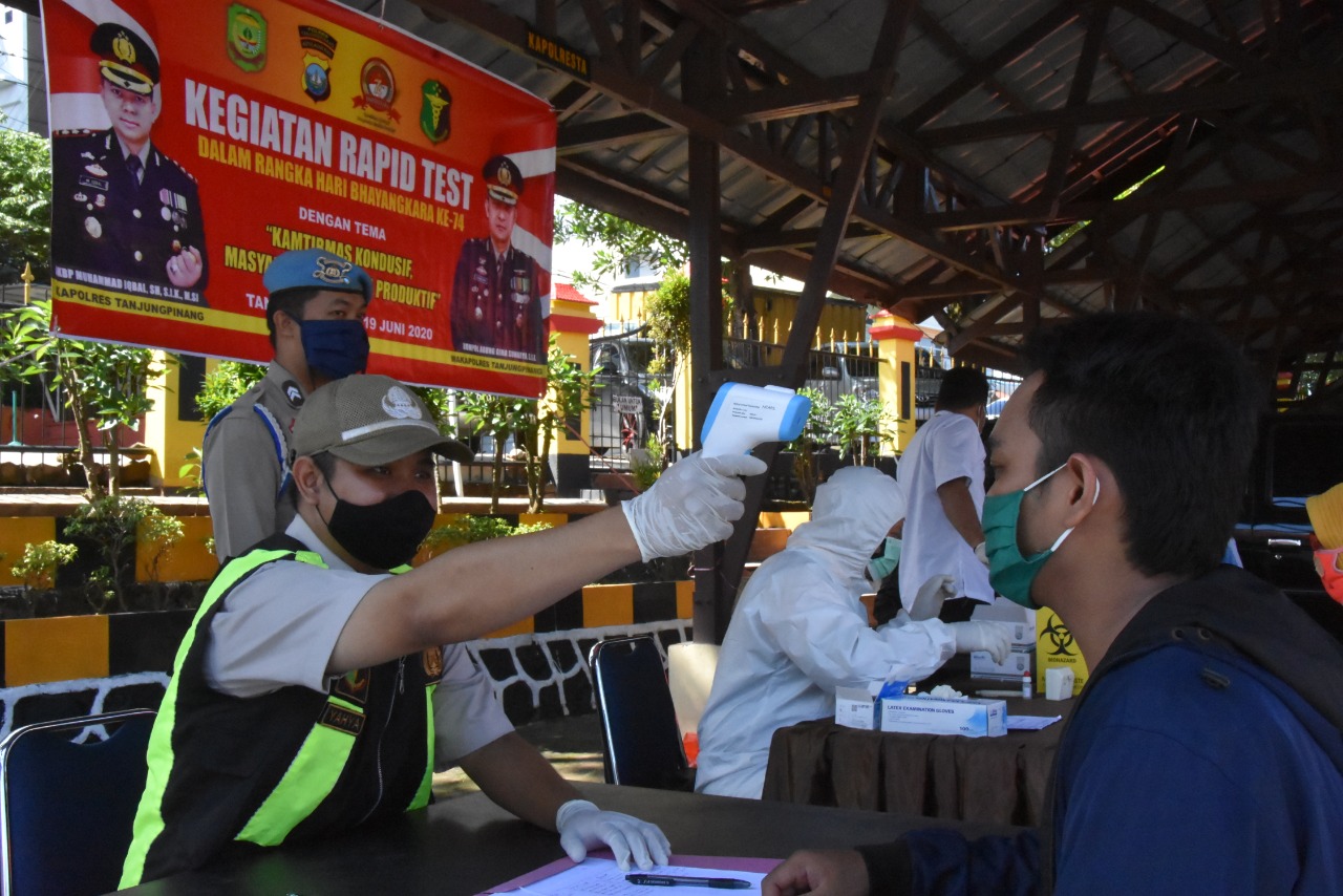 Dalam rangka peringatan Hari Bhayangkara ke -74, Polres Tanjungpinang menggelar layanan Rapid Test bertempat di halaman parkir masuk Mapolres Tanjungpinang, Jumat (19/6/2020).