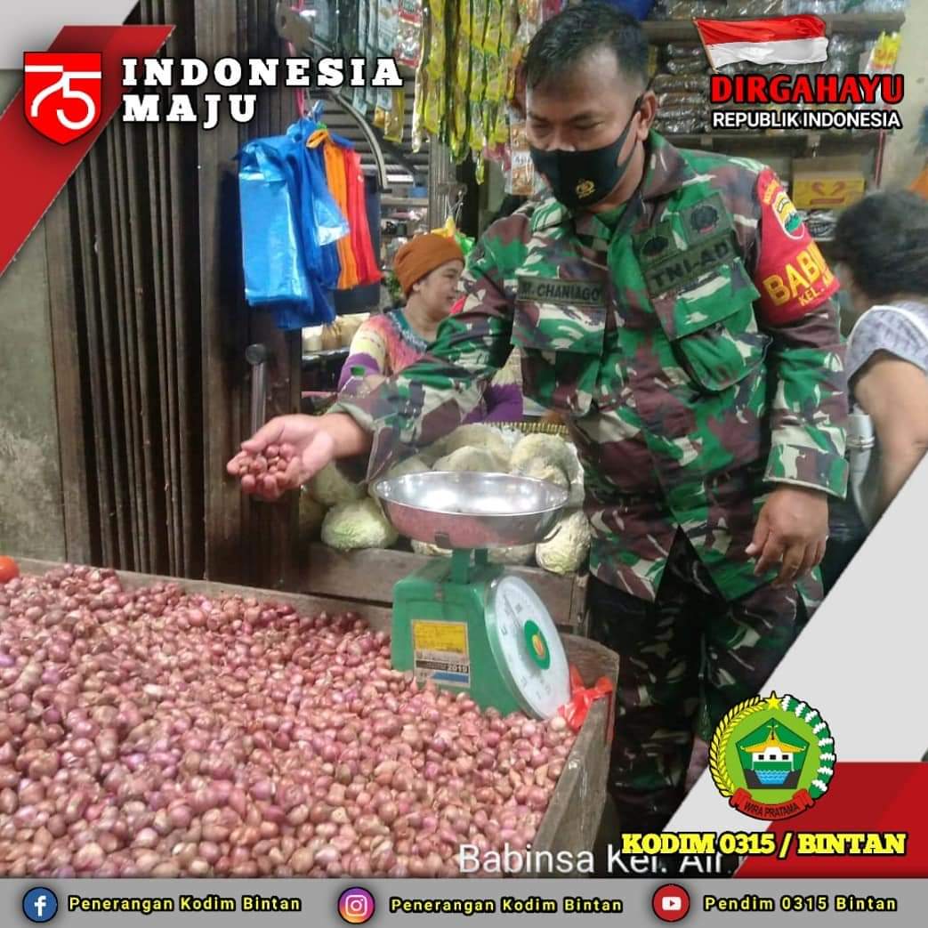 Babinsa Air Raja Koramil 01/0315 Bintan, Koptu Mardianto mendatangi para pedagang sembako dan melaksanakan monitoring harga sembako di Pasar Bintan Center, KM 9 Tanjungpinang, Selasa (01/9/2020).