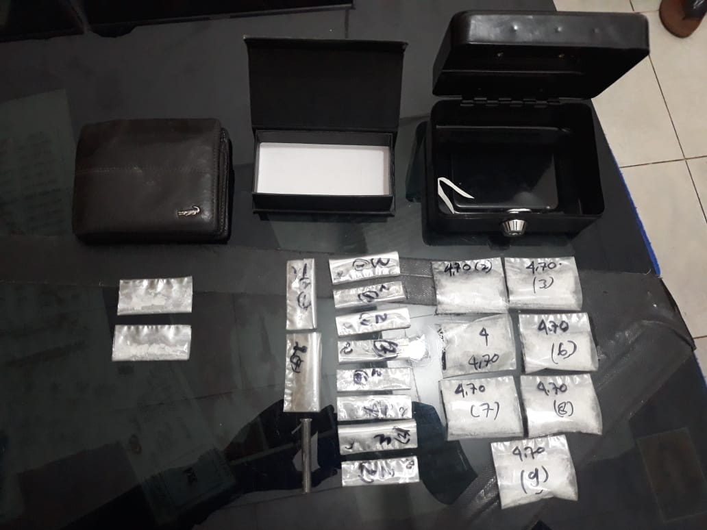 Kemudian didampingi Ketua RT setempat melakukan penggeledahan dan menemukan dalam tas sandang warna coklat berisikan 1 (satu) buah kotak kecil merk PIONEER DJ warna hitam berisikan 10 (sepuluh) paket diduga narkotika jenis sabu yg dibungkus plastik transparan. Di lantai kamar ditemukan 1 (satu) buah dompet warna coklat didalamnya terdapat 2 (dua) paket diduga narkotika jenis sabu yang dibungkus plastik transparan, seperangkat alat hisap sabu (Bong), 1 (satu) buah kotak besi kecil merk HELLO KITTY berisikan 1 (satu) bundel plastik transparan, 1 (satu) unit timbangan digital merk HARNIC warna silver, di samping rumah ditemukan 1 (satu) unit sepeda motor merk Honda beat. Di dalam jok motor 1 (satu) buah kotak brankas kecil warna hitam yang di dalamnya terdapat 7 (tujuh) paket diduga narkotika jenis sabu terbungkus plastik transparan, 1 (satu) unit Hp merk XIAOMI Note 7 warna biru. Setelah diinterogasi diakui kepemilikannya oleh Lk. “SA”.