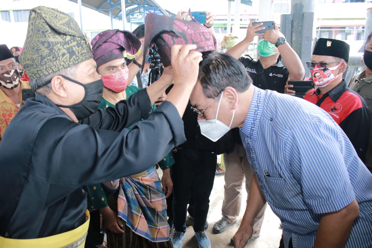 Tiba di Karimun, Soerya Respationo Dikenakan Tanjak dan Beras Kuning, Pekik “Romo Menang” Menggema