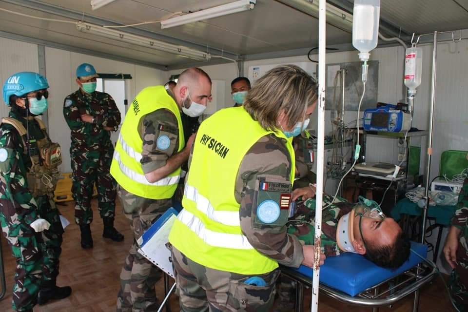 Demikian skenario latihan bersama personnel tim kesehatan lapangan atau dikenal dengan sebutan Force Medical Team (FMT) yang tergabung dalam Satuan Tugas (Satgas) Indobatt XXIII-O UNIFIL saat melaksanakan latihan bersama dengan tim evakuasi medis udara Perancis Aero Medical Evacuation Team (AMET) bertempat di Husada Level I Hospital adchit Al Qusyr Lebanon Selatan, Sabtu (06/03/2021).