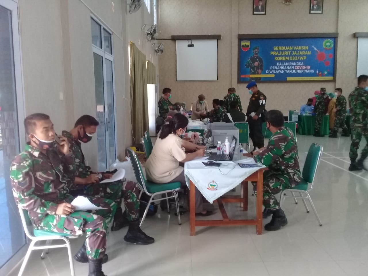 Dalam rangka mensukseskan vaksinasi nasional Covid-19 untuk penanganan pandemi Covid-19, ratusan prajurit dan PNS jajaran Korem 033/WP melaksanakan vaksinasi tahap kedua bertempat di Gedung Serba Guna Makorem 033/WP, Senin (8/3/2021) sekira pukul 08.00 WIB.