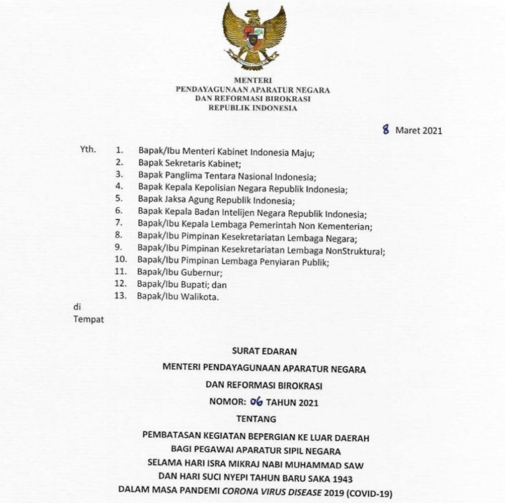Larangan ini tertuang dalam Surat Edaran Menteri Pendayagunaan Aparatur Negara dan Reformasi Birokrasi (PANRB) Nomor 6 Tahun 2021 tentang Pembatasan Kegiatan Bepergian ke Luar Daerah bagi Pegawai ASN Selama Hari Isra Mikraj Nabi Muhammad SAW dan Hari Suci Nyepi Tahun Baru Saka 1943 dalam Masa Pandemi COVID-19.
