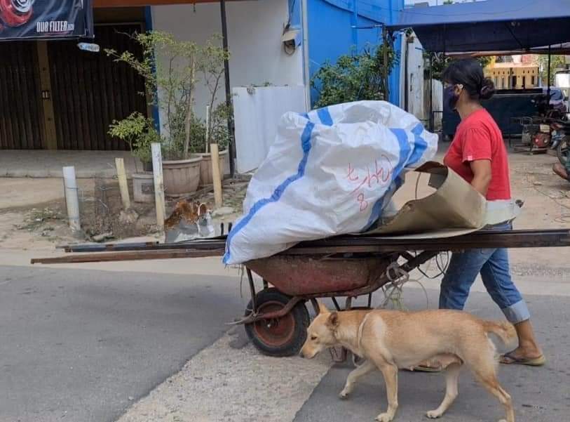 Anjing itu duduk tenang di bawah gerobak. Tuannya seorang perempuan berkaos merah itu tampak sibuk mencari barang rongsokan.