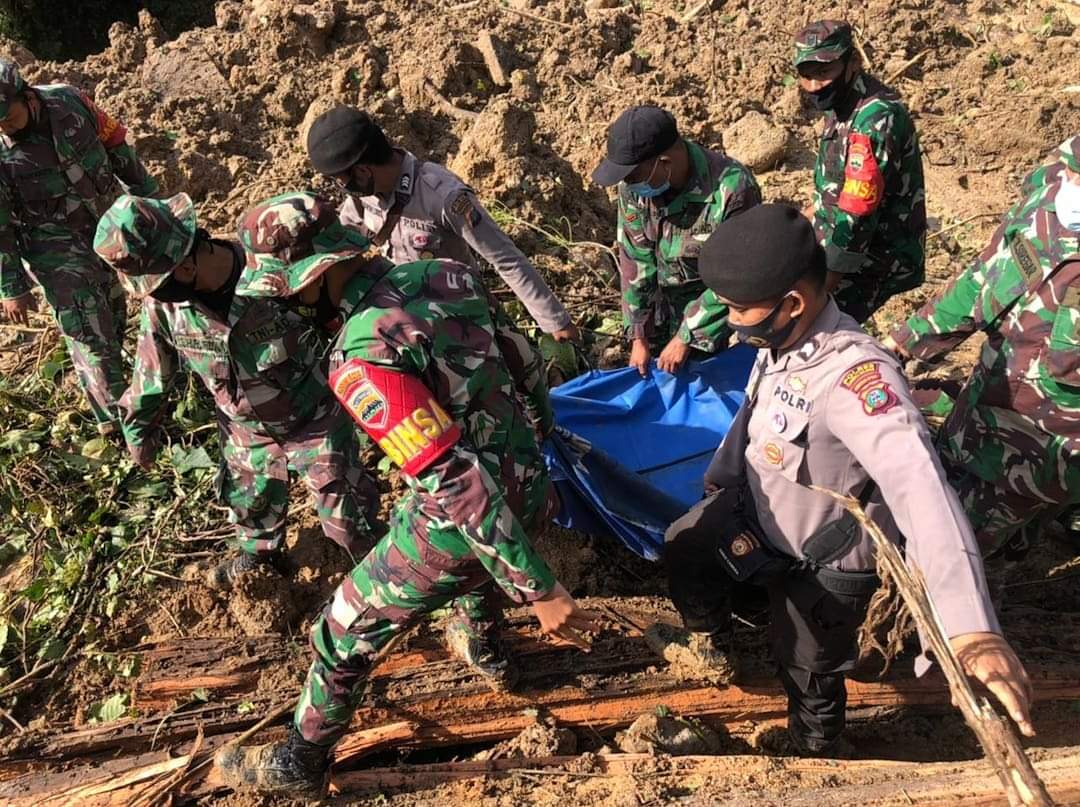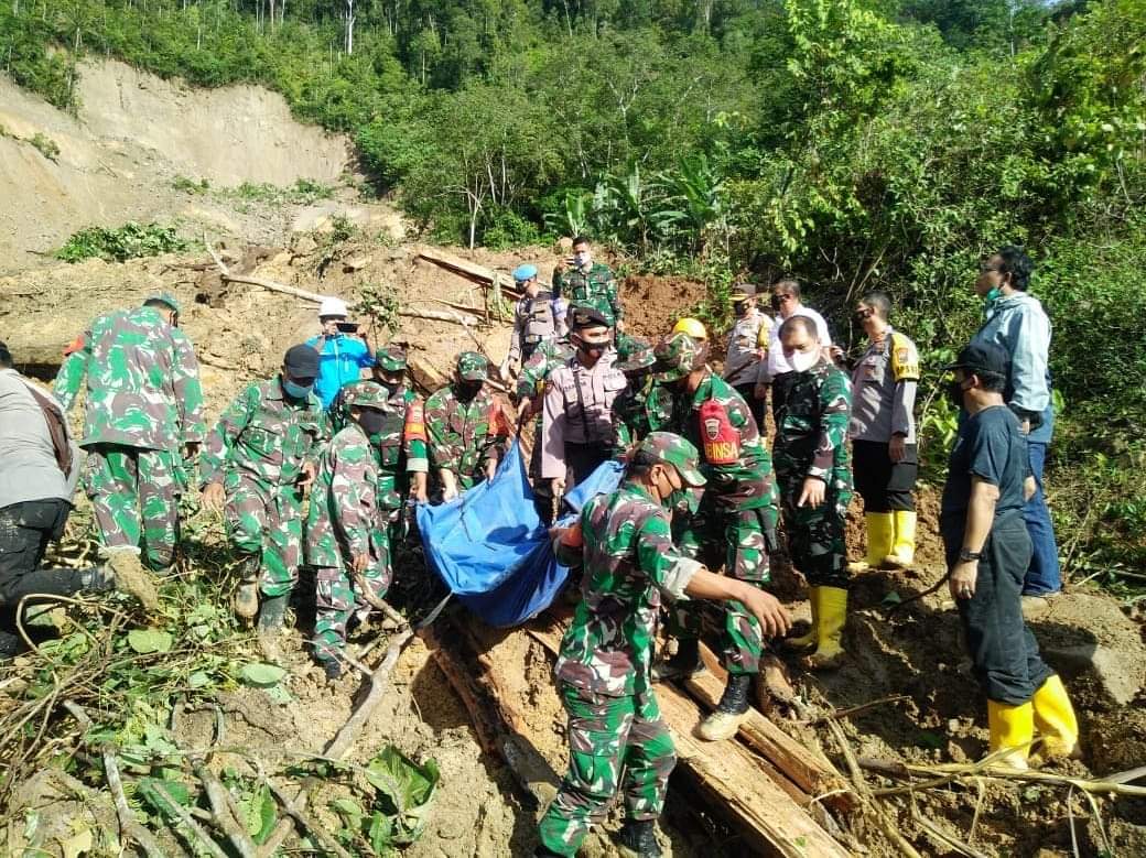 Tim gabungan dari Komando Distrik Militer (Kodim) 0212/Tapsel, Polres, SAR dan Badan Penanggulangan Bencana Daerah (BPBD) setempat berjibaku mengevakuasi korban tanah longsor yang terjadi di Desa Marancar Godang, Kecamatan Marancar, Kabupaten Tapanuli Selatan, Jum’at (30/04/2021)