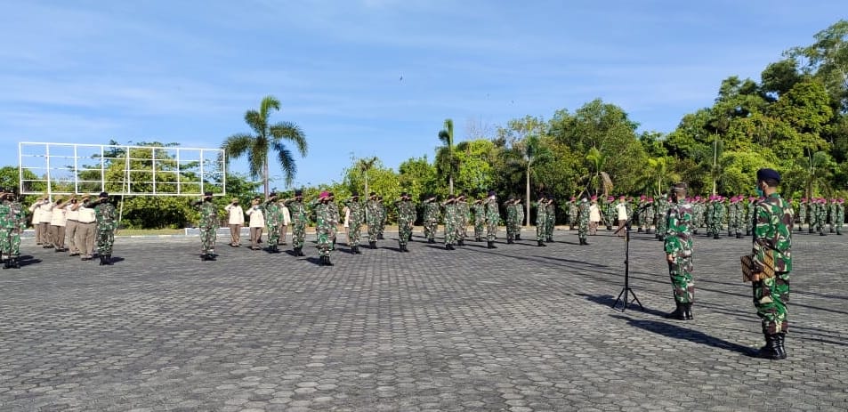 Wakil Komandan Pangkalan Utama TNI Angkatan Laut (Wadanlantamal) IV Tanjungpinang, Kolonel Marinir Andi Rahmat M, memberikan pengarahan pada saat apel gabungan di hadapan segenap prajurit dan PNS Lantamal IV di Lapangan Apel Markas Komando (Mako) Lantamal IV, Tanjungpinang, Senin (03/5/2021) pagi.