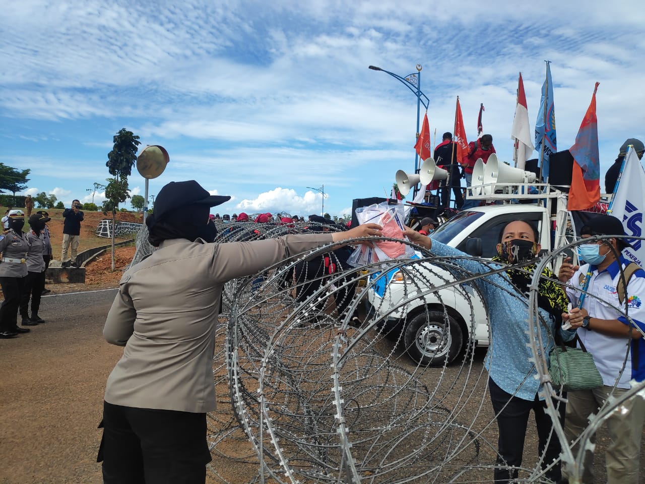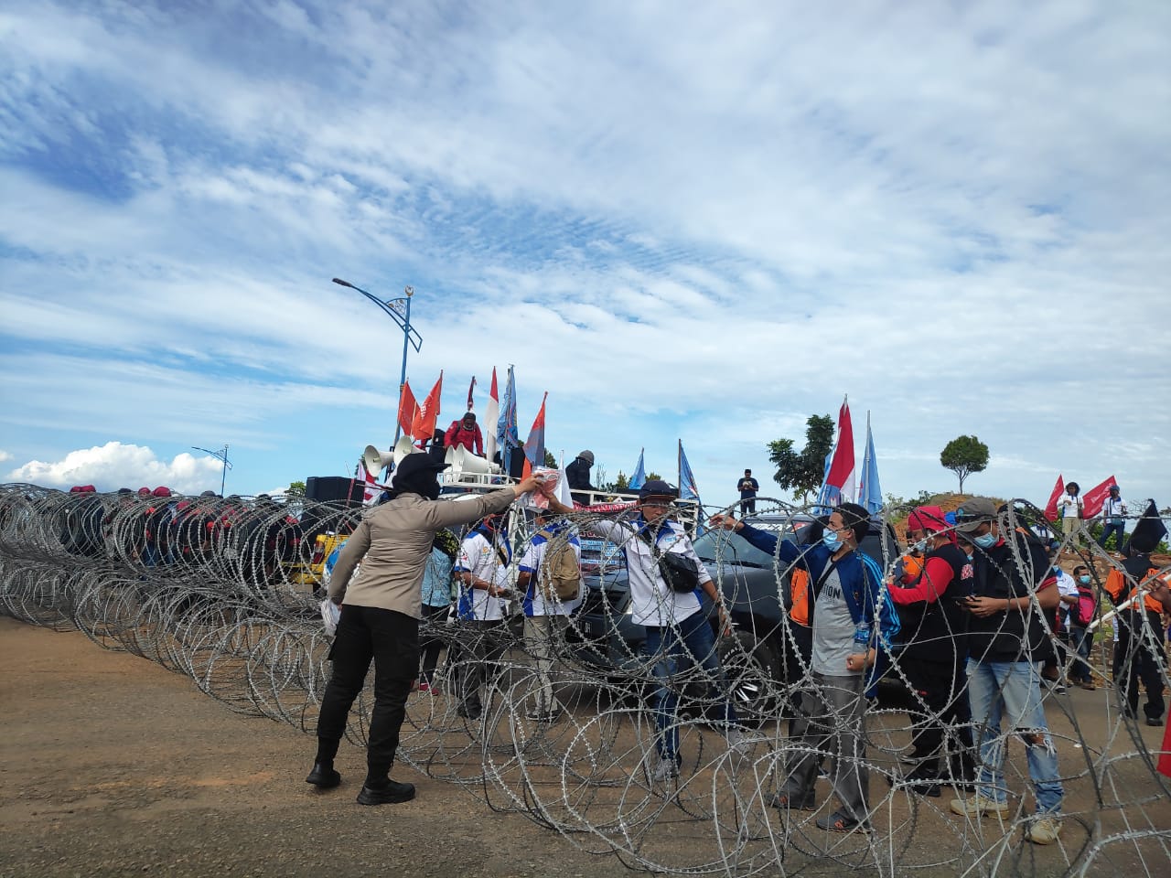 Kedatangan masa disambut oleh Tim Negosiator Polres Tanjungpinang dengan imbauan agar tetap menerapkan protokol kesehatan dalam pelaksanaan orasinya.