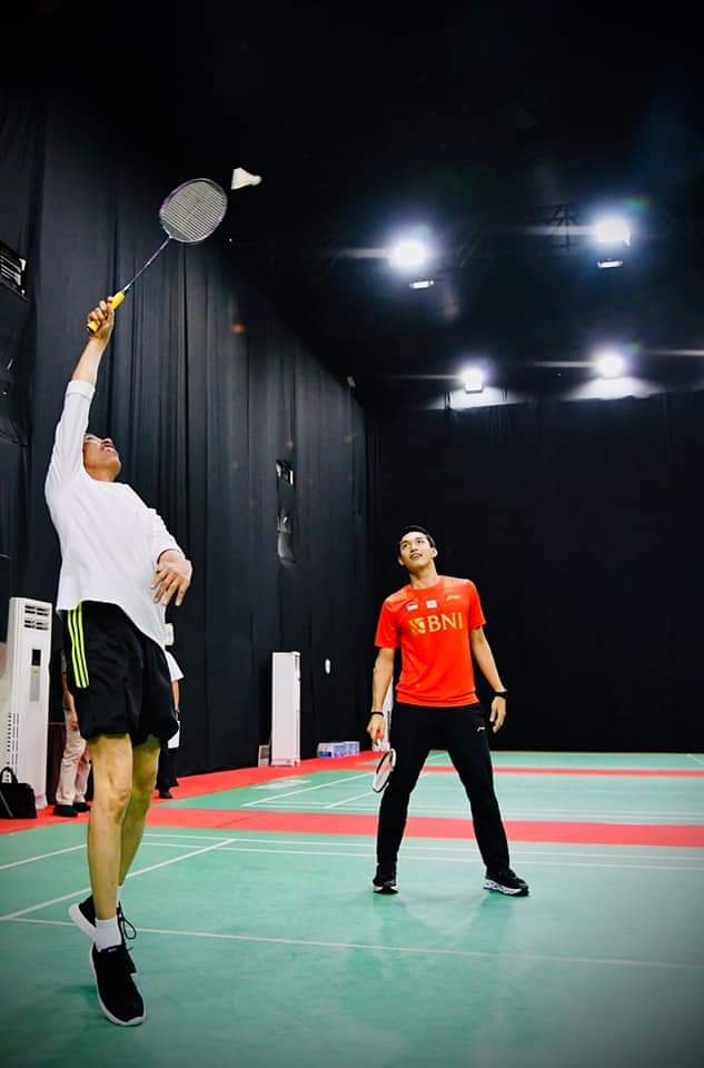 Bertanding di lapangan latihan, Presiden Jokowi tampak berpasangan dengan atlet tunggal putra, Jonathan Christie. Keduanya bertanding melawan Hendra Setiawan yang berduet dengan Ketua Umum Persatuan Bulu Tangkis Seluruh Indonesia (PBSI), Agung Firman Sampurna.