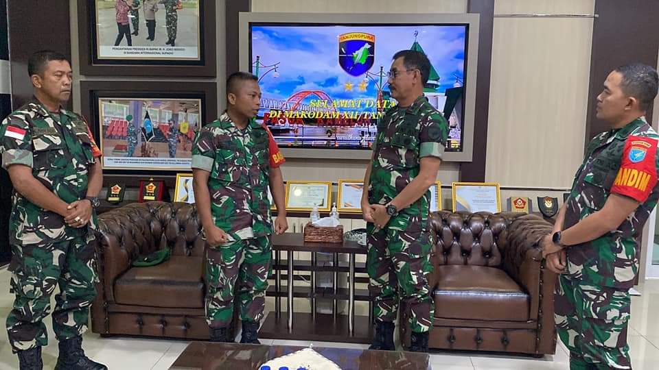 Panglima Kodam XII/Tanjungpura Mayjen TNI Sulaiman Agusto, S.I.P., M.M., memberikan apresiasi dan penghargaan kepada Babinsa penolong warga yang sedang mengalami kecelakaan tunggal.