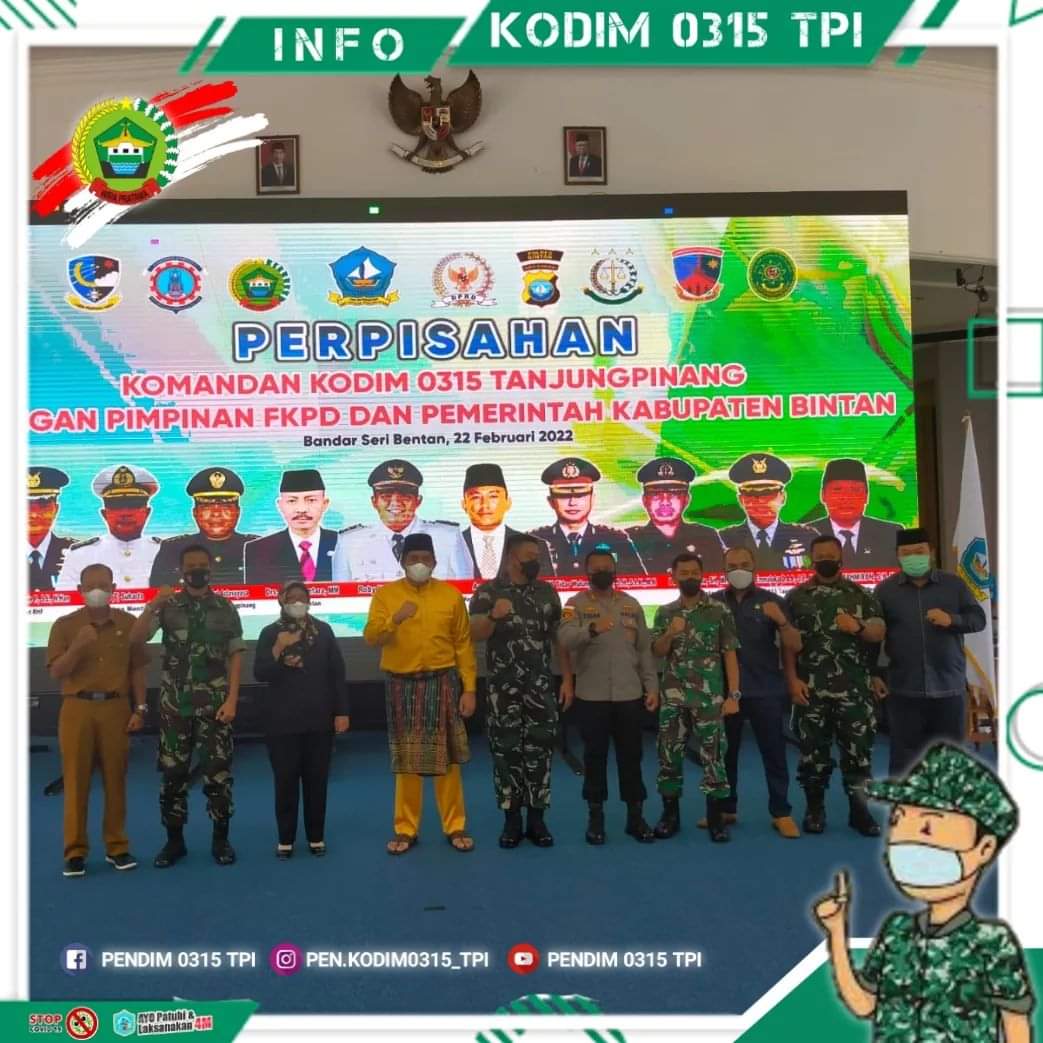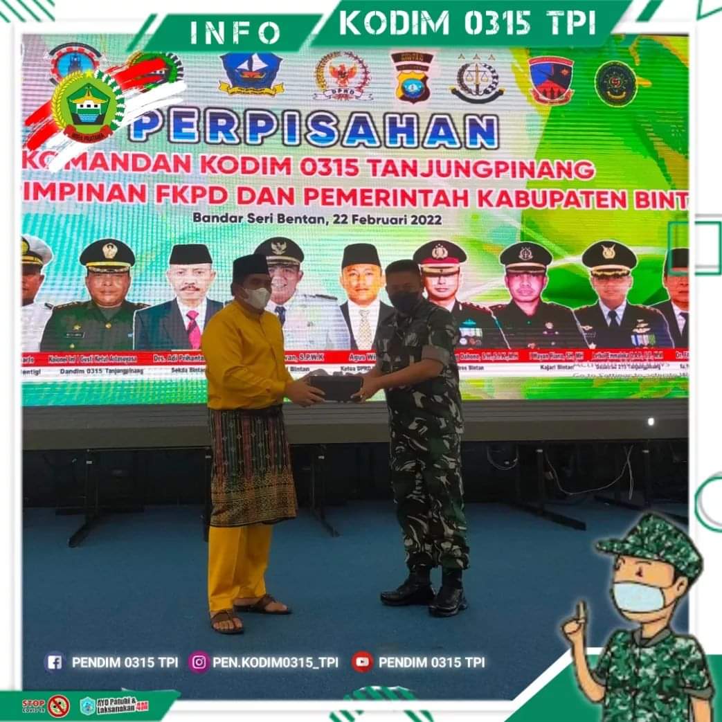 Perpisahan Komandan Kodim 0315/Tanjungpinang digelar dengan nuansa yang penuh rasa kekeluargaan dan rasa haru itu dilaksanakan oleh Pemkab Bintan yang bertempat di Aula Kantor Bupati Bintan, Jalan Bandar Sribentan, Kecamatan Teluk Bintan, Kabupaten Bintan, Selasa (22/2/2022).