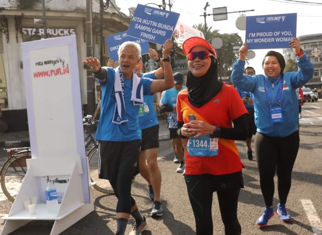 Dukungan Ganjar ditunjukkan dengan berlari mengiringi Siti Atikoh sambil mengangkat tulisan “Kita Ikutin Bunda Sampai Garis Finish”. Ganjar juga sempat memberikan kecupan sayang agar istri tercintanya semangat berlari sampai garis finish.