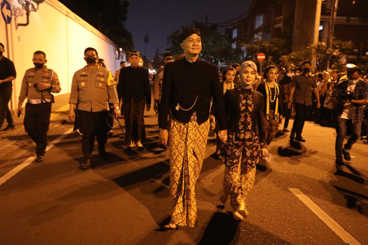Ganjar yang ditemani istri, Siti Atikoh berjalan kaki mengikuti rute kirab bersama rombongan keprajuritan. Yakni dari pendapa, keluar ke selatan, Pamedan, ke arah barat muter Mangkunegaran satu kali, kemudian masuk ke area pendapa.