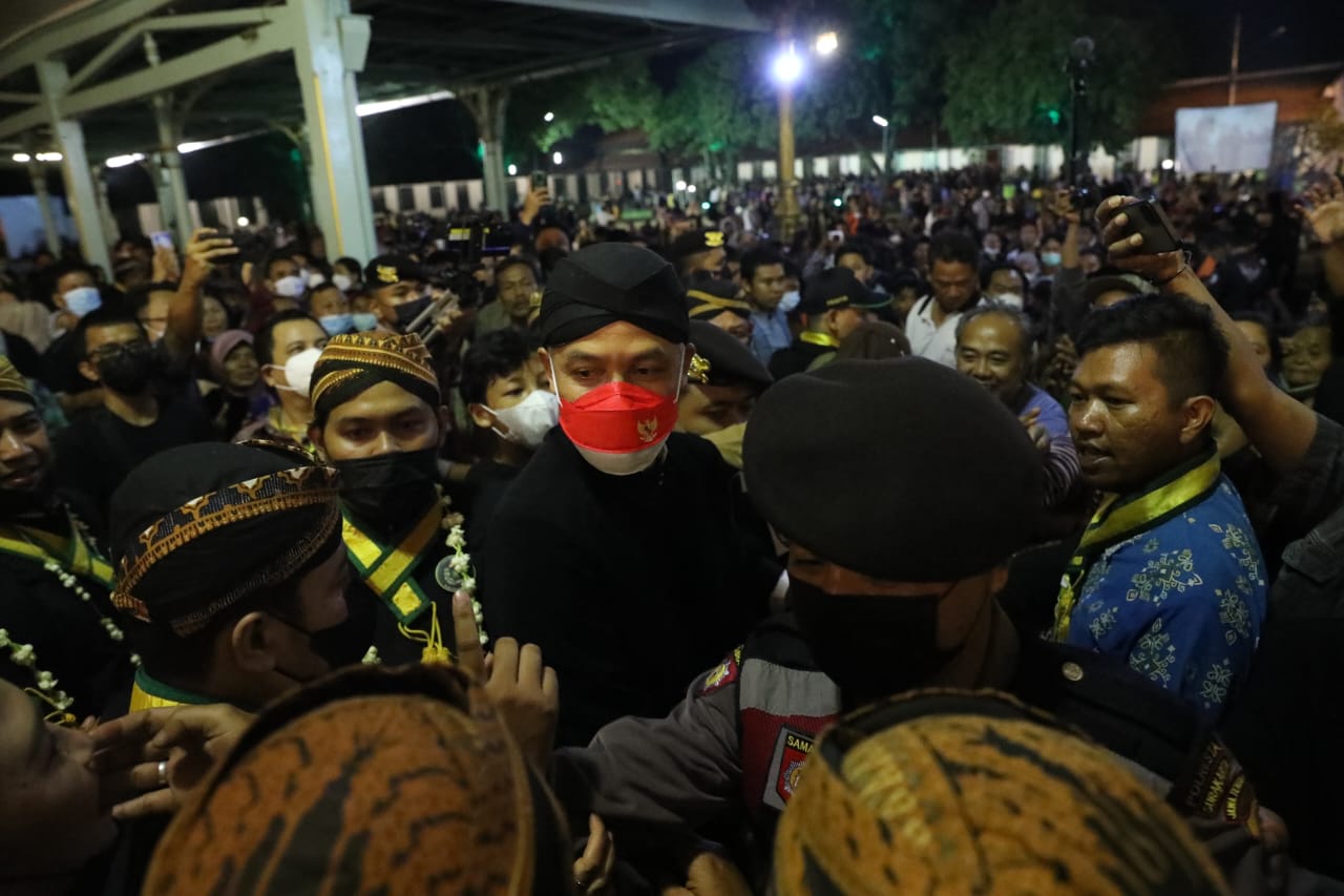 Gubernur Jawa Tengah, Ganjar Pranowo mengikuti prosesi Kirab Pusaka Dalem 1 Sura EHE 1956, Jumat (29/7/2022) malam.