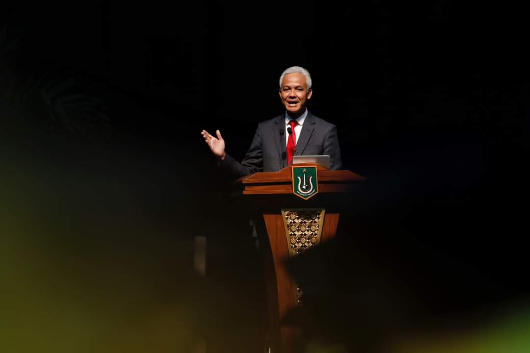 Di atas podium, orang nomor satu di Jawa Tengah itu memberikan motifasi dengan kisah inspiratif yang dilakukannya selama menghadapi pandemi Covid-19. Mulai dari Lapak Ganjar, yang membantu UMKM lokal agar tetap survive di tengah badai pandemi. Program promosi gratis berbasis media sosial itu hingga kini masih efektif berjalan.