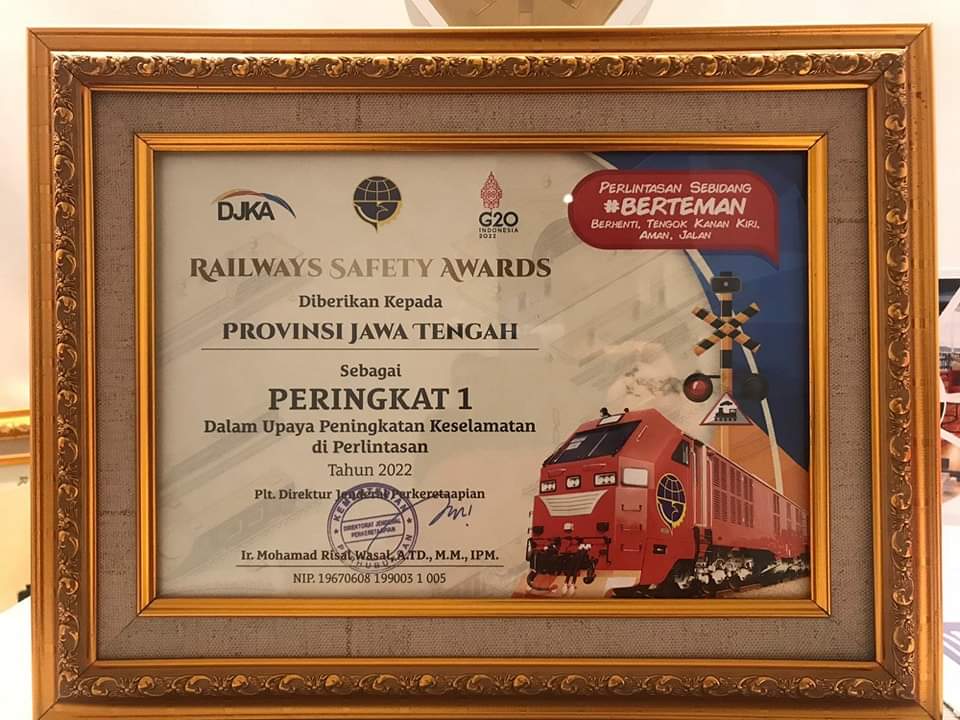 Provinsi Jawa Tengah menyabet juara pertama Railway Safety Awards 2022. Ajang ini merupakan apresiasi dari Kementerian Perhubungan bagi daerah yang ikut serta dalam pengamanan perlintasan sebidang perjalanan kereta api.