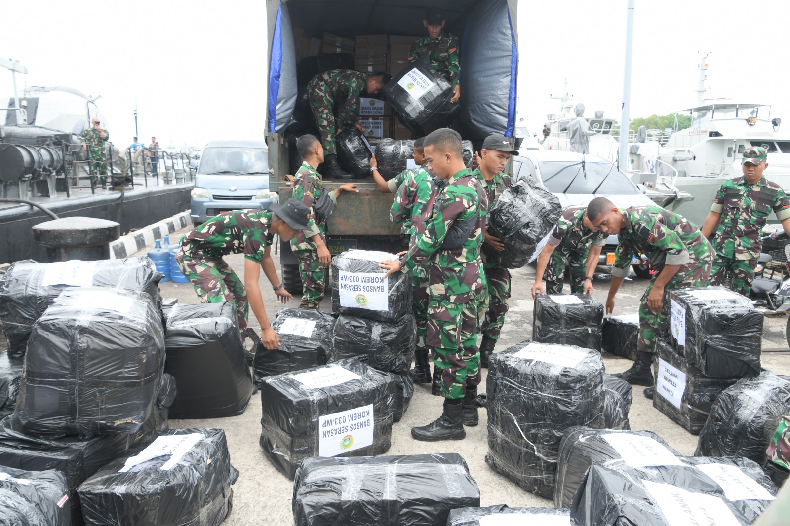 Ia menambahkan bahwa paket bansos yang sudah terkumpul ini akan diangkut menggunakan dua unit kendaraan truk Korem 033/WP yang nantinya akan bergabung dengan pengiriman paket bansos dari Koarmada I TNI AL dengan menggunakan KRI Silas Papare dengan Komandan KRI Letkol Laut (P) Agus Yunianto.