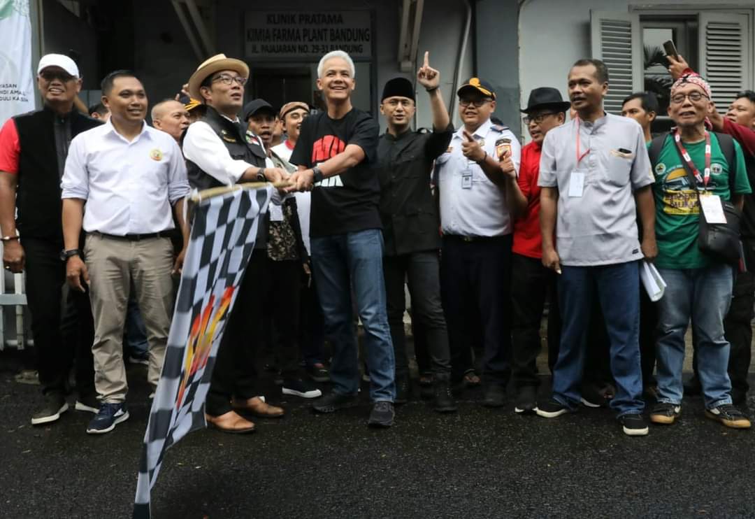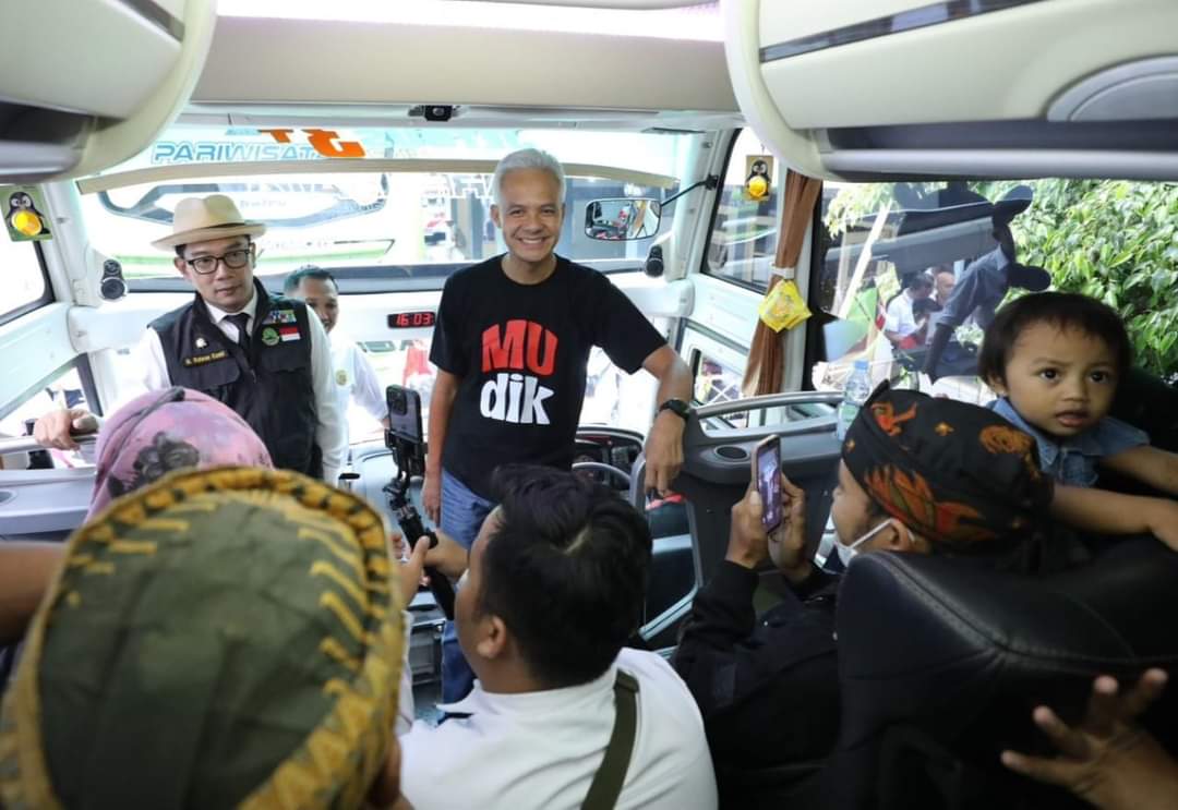Ganjar didampingi Ridwan Kamil kemudian menyapa para pemudik dan melepas keberangkatan bus dengan mengibarkan bendera start bersama.