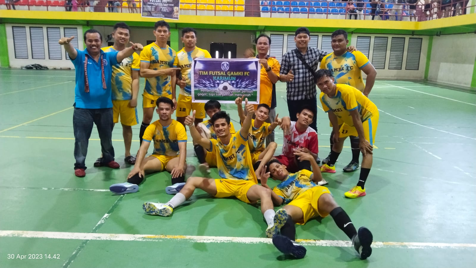 Tim Gamki FC Karimun berhasil meraih juara satu pada Turnamen Futsal Federasi Olahraga Pemuda Batak Karimun (FOPBK) 2023 yang diselenggarakan di Stadion Mini Badang Perkasa Karimun, Minggu (30/4/2023).