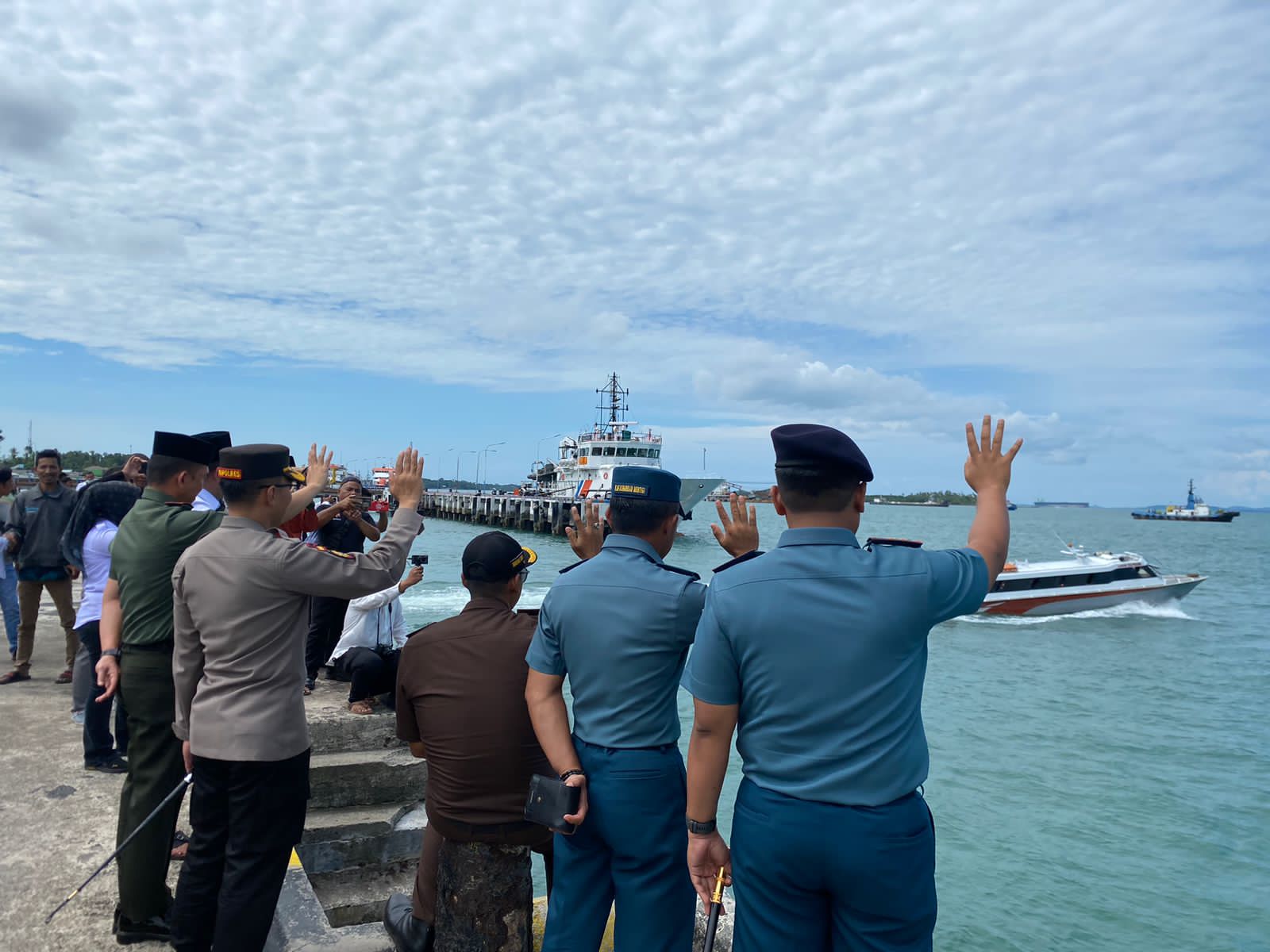 Kapolres Bintan, AKBP Riky Iswoyo, S.I.K., M.M bersama dengan Bupati Bintan Roby Kurwniawan, S.P.W.K serta Forum Komunikasi Pimpinan Daerah (Forkompimda) Kabupaten Bintan lainnya melepas keberangkatan rombongan calon jama’ah haji asal Kabupaten Bintan tahun 2023 di Pelabuhan Bulang Linggi, Tanjung Uban, pada Rabu (24/5/2023) pagi.