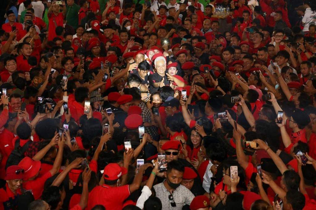 Calon Presiden PDIP, Ganjar Pranowo membakar semangat ribuan kader PDIP Sumatera Utara di GOR serbaguna Pemprov Sumut, Minggu (11/6/2023).