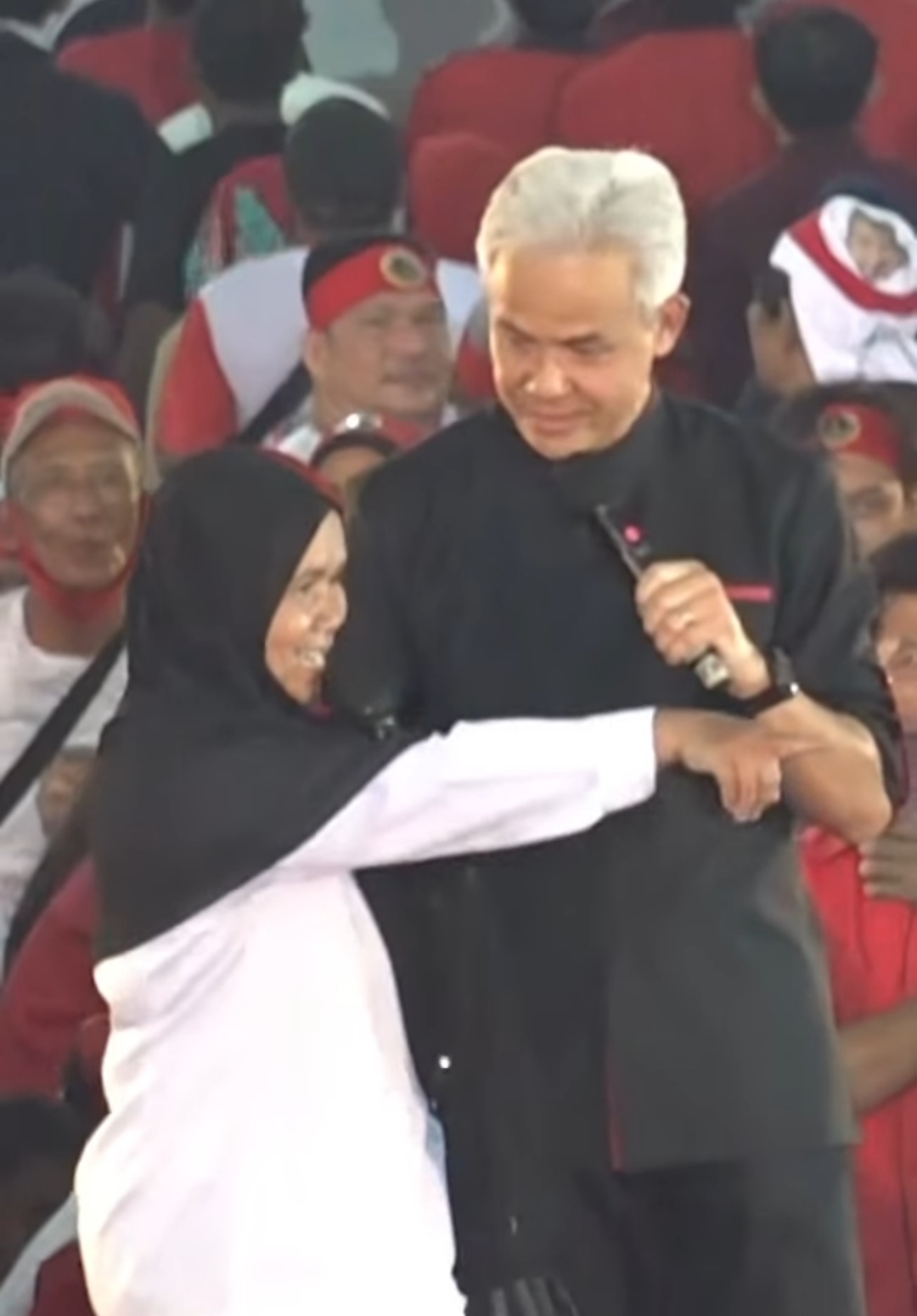 Karena dekat dan terlihat sangat antusias, Ganjar kemudian mempersilakan Lily naik ke atas panggung. Betapa senangnya ketika ia bisa bersalaman dengan Ganjar dan ngobrol bersama.