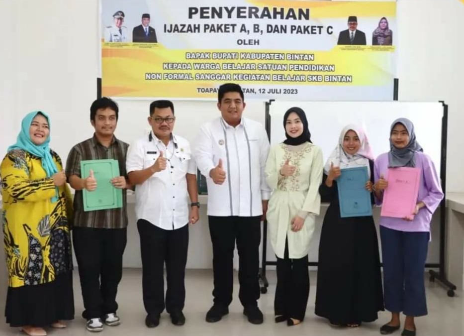 Bupati Bintan Roby Kurniawan didampingi Ketua TP PKK Bintan menghadiri penyerahan ijazah paket A, B dan C kepada warga belajar Satuan Pendidikan Non Formal Sanggar Kegiatan Belajar (SKB) Bintan, di Gedung SKB Bintan, Rabu (12/7/2023).