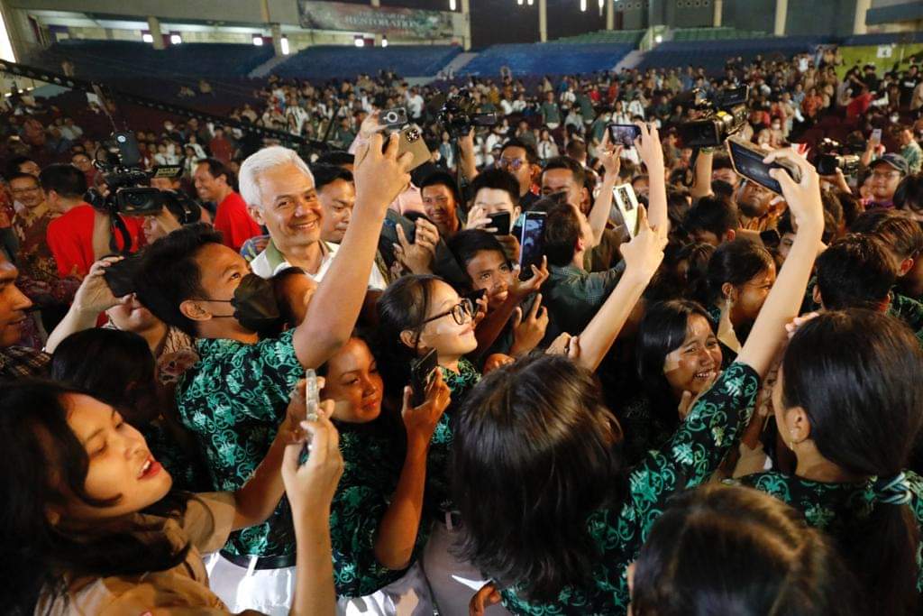 Disambut dengan gegap gempita dan antusiasme peserta yang hadir, Ganjar pun kemudian berinteraksi dengan mengajak anak-anak untuk mendampinginya di panggung.