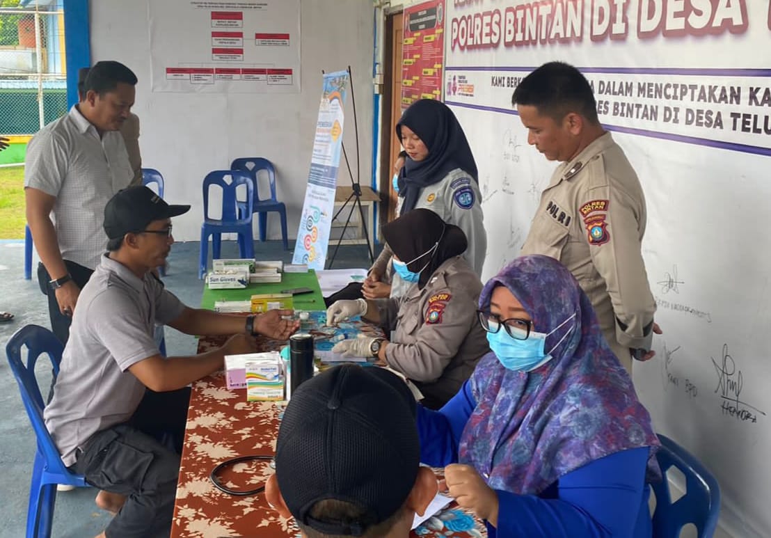 Polres Bintan membuka layanan kesehatan dengan membuka pos kesehatan dengan melakukan pemeriksaan kesehatan secara gratis kepada masyarakat Desa Teluk Sasah, Kecamatan Seri Kuala Lobam, sekitarnya yang dibuka di Posko kampung bebas narkoba, Senin (11/9/2023).