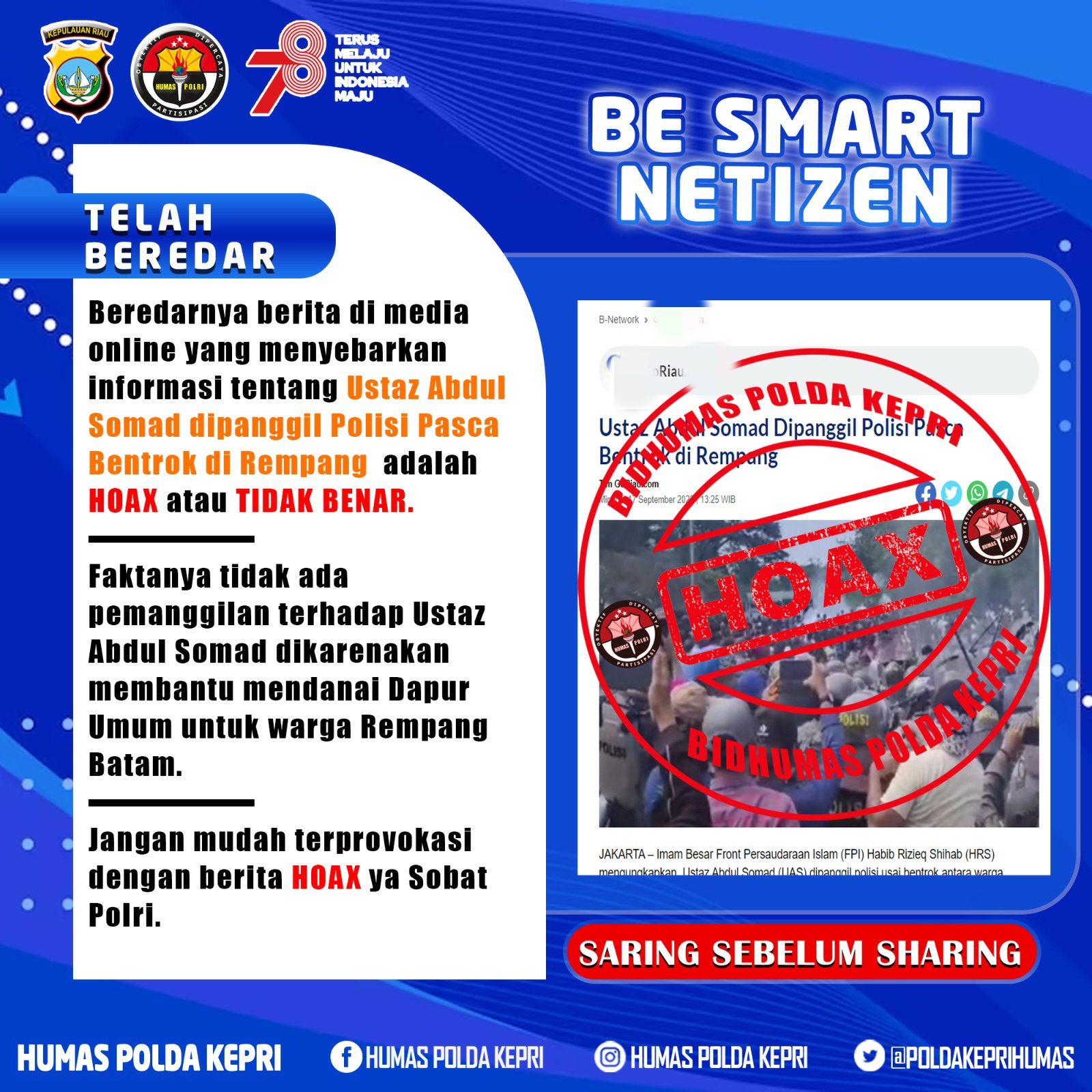 Kabidhumas Polda Kepri Kombes. Pol. Zahwani Pandra Arsyad, S.H. M.Si., menegaskan bahwa beredarnya berita di salah satu media online yang menyebarkan informasi tentang “Ustaz Abdul Somad dipanggil Polisi Pasca Bentrok di Rempang” adalah hoax atau tidak benar.