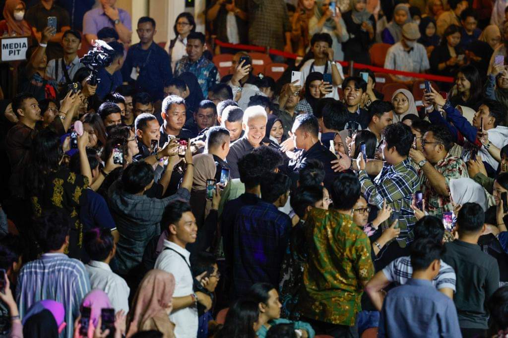 Tepuk tangan dan teriakan nama Ganjar bergemuruh ketika alumni FH UGM itu memasuki Gedung Grha Sabha tempat ia bersama dua bacapres lainnya mengadu gagasan.