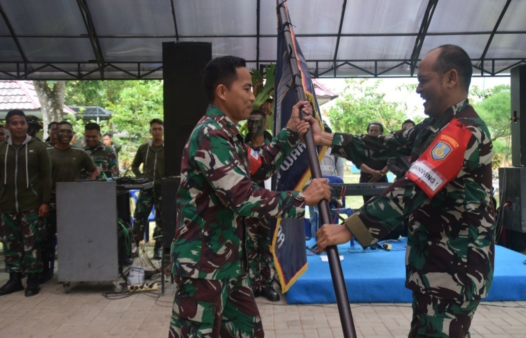 Komandan Skuadron 800 Wing Udara 1 Mayor Laut (P) Wahyu Ardiansyah, S.H., M.Tr.Opsla, menerima bendera juara bergengsi Skuadron Warrior yang diserahkan oleh Komandan Wing Udara 1 Puspenerbal, Kolonel Laut (P) Dani Achnisundani, S.H., M.Tr.Hanla., M.M, di Tanjungpinang, Jumat (23/9/2023).