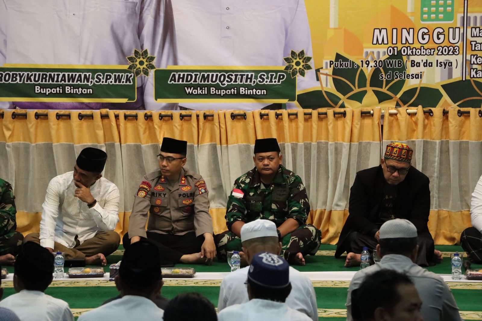Peringatan Maulid Nabi Muhammad SAW 1445 Hijriyah tersebut dilaksanakan di Masjid Baitul Makmur, Kecamatan Bintan Utara yang dihadiri oleh Kepala Kepolisian Resor (Kapolres) Bintan AKBP Riky Iswoyo, S.I.K., M.M. Bupati Bintan Robby Kurniawan, S.Pw. K beserta Forum Komunikasi Pimpinan Daerah (Forkopimda) Kabupaten Bintan, Minggu (1/10/2023).