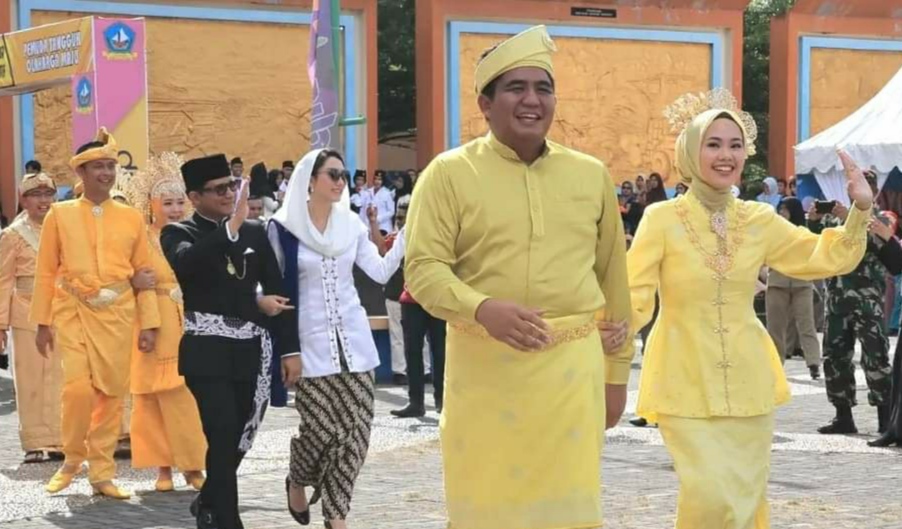Bupati Bintan Roby Kurniawan terlihat begitu serasi mengenakan pakaian adat kebesaran Melayu berbaju kurung lengkap dengan songket samping dan tanjak bersama Ketua TP PKK Bintan.