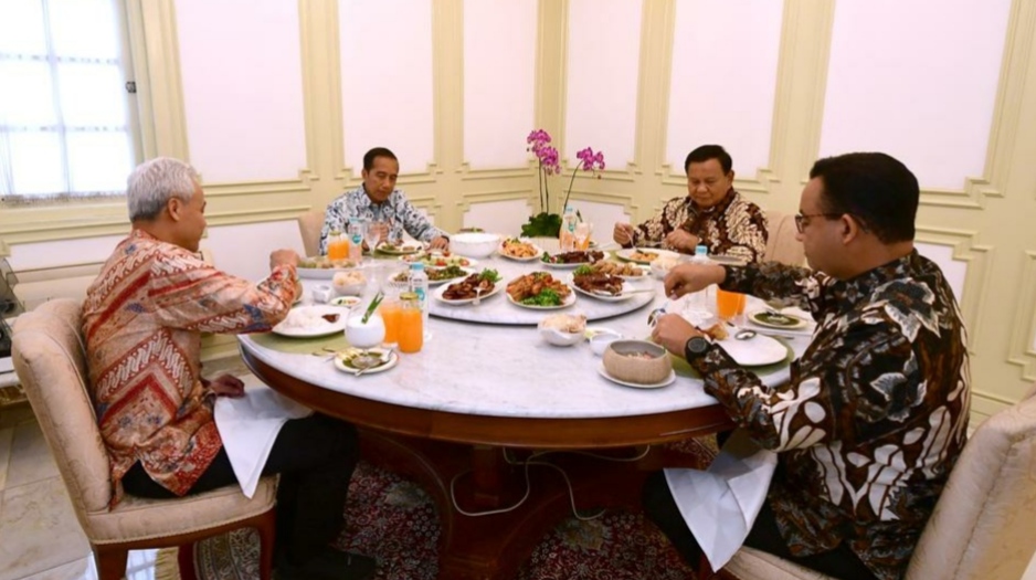 Presiden RI Joko Widodo (Jokowi) santap siang bersama tiga calon presiden yang akan berpartisipasi pada pemilihan presiden 2024, yaitu Prabowo Subianto, Ganjar Pranowo, dan Anies Baswedan.