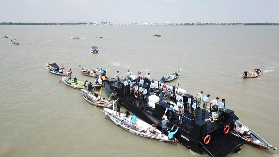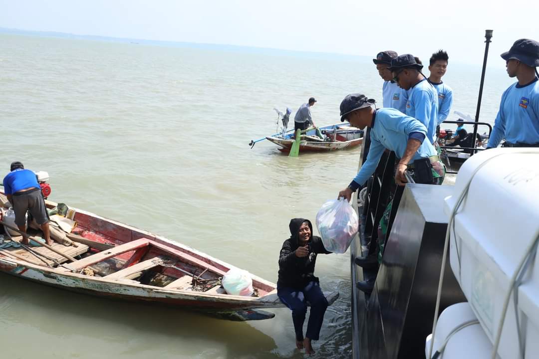 Dalam rangka memperingati HUT ke- 62 Komando Pasukan Katak (Kopaska) pada tanggal 31 Maret 2024 mendatang, prajurit Satuan Pasukan Katak (Satkopaska) Koarmada II membagikan sembako kepada para nelayan di Perairan Kenjeran, Surabaya, Selasa (19/3/2024).
