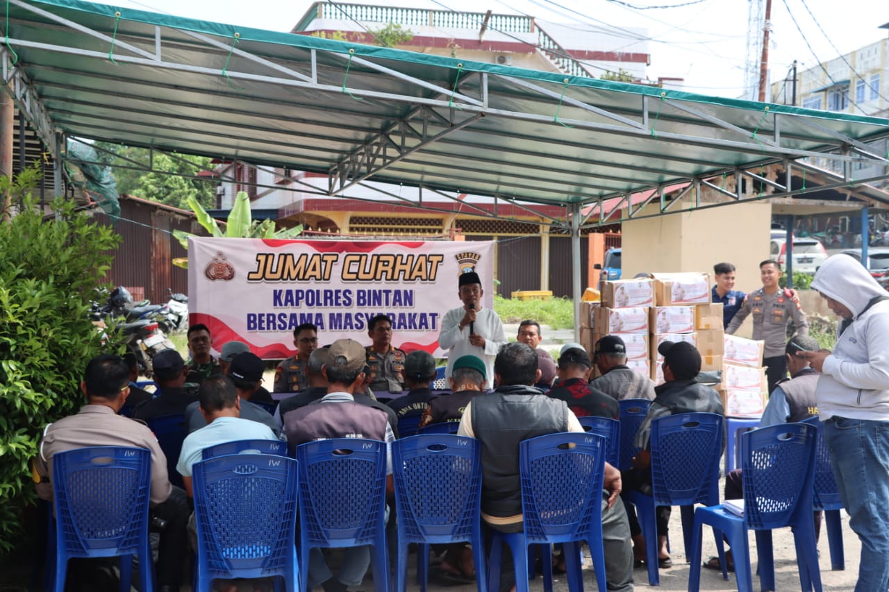 Kapolres Bintan AKBP Riky Iswoyo, S.I.K., M.M melaksanakan Jumat Curhat yang dilaksanakan di Pelabuhan Pantai Indah, Kelurahan Kijang Kota, wilayah hukum Polsek Bintan Timur usai Salat Jumat (22/3/2024).