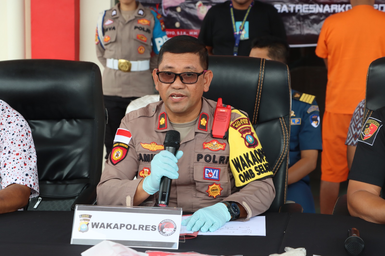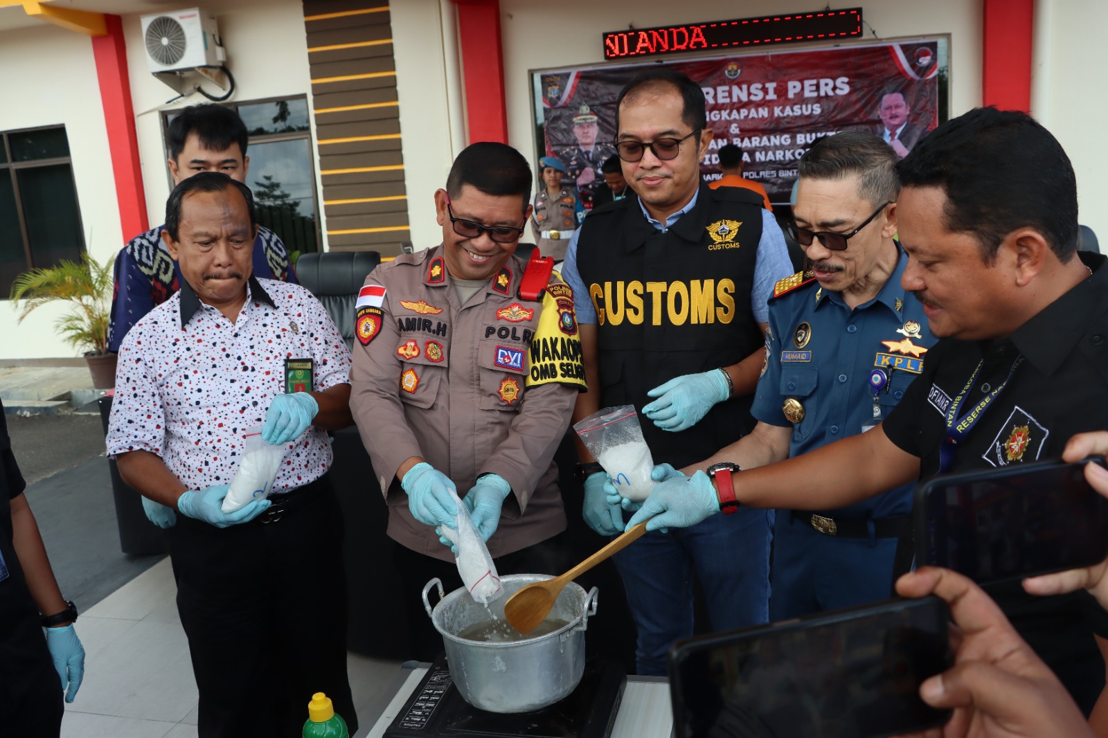 “Hari ini kita akan melaksanakan konferensi pers pemusnahan narkotika jenis sabu seberat 1 Kg, yang mana barang haram tersebut kita dapatkan saat petugas kepolisian yang berjaga di Pelabuhan Sri Bayintan, Kijang, bersama petugas lainnya, melakukan kegiatan rutin kepada setiap penumpang kapal. Dan ditemukan 1 orang pria yang mencurigakan serta didapati barang haram itu berada di tubuh pria tersebut,” terang Wakapolres Bintan.