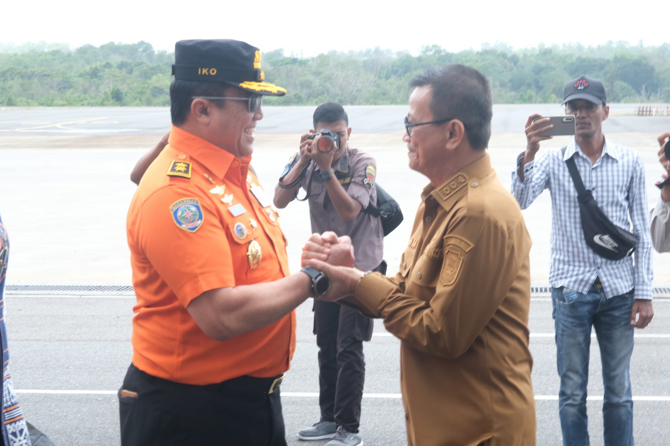 Dua pejabat tinggi TNI, yaitu Marsekal Muda TNI Widyargo Ikoputra, S.E., M.M., CIQaR, Deputi Bidang Sarana dan Prasarana serta Siskom Pencarian dan Pertolongan, bersama Brigadir Jenderal TNI Tofik Tofana, S.T., Direktur Sistem Komunikasi, disambut di Bandara Raja Haji Fisabilillah, Senin (14/07/2025).