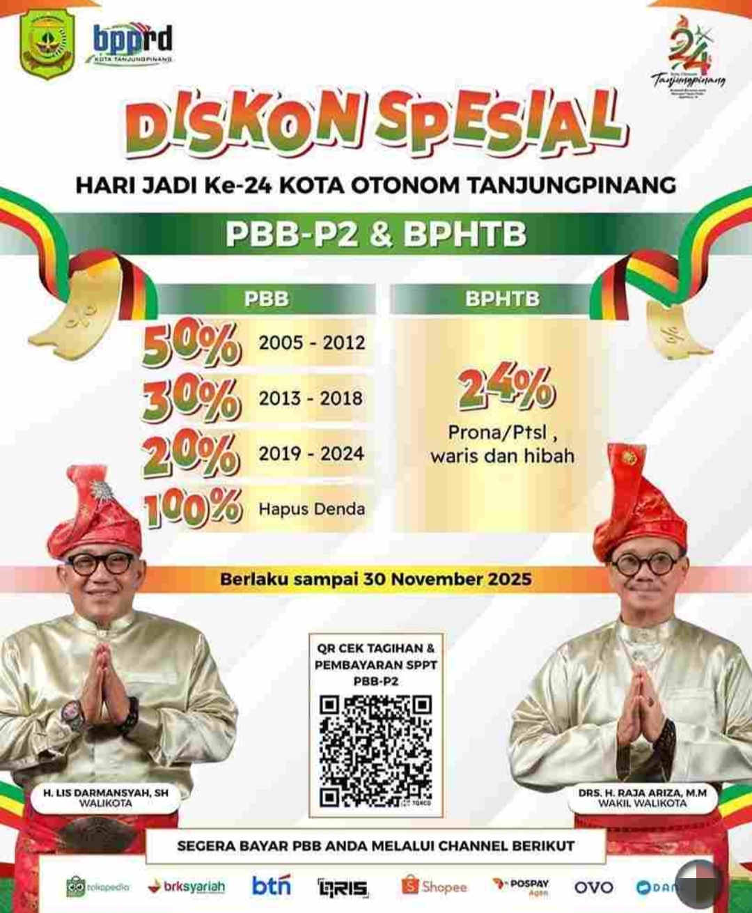 Kado Indah Hari Jadi ke- 24 Kota Otonom Tanjungpinang, Warga Dapat Diskon PBB dan BPHTB