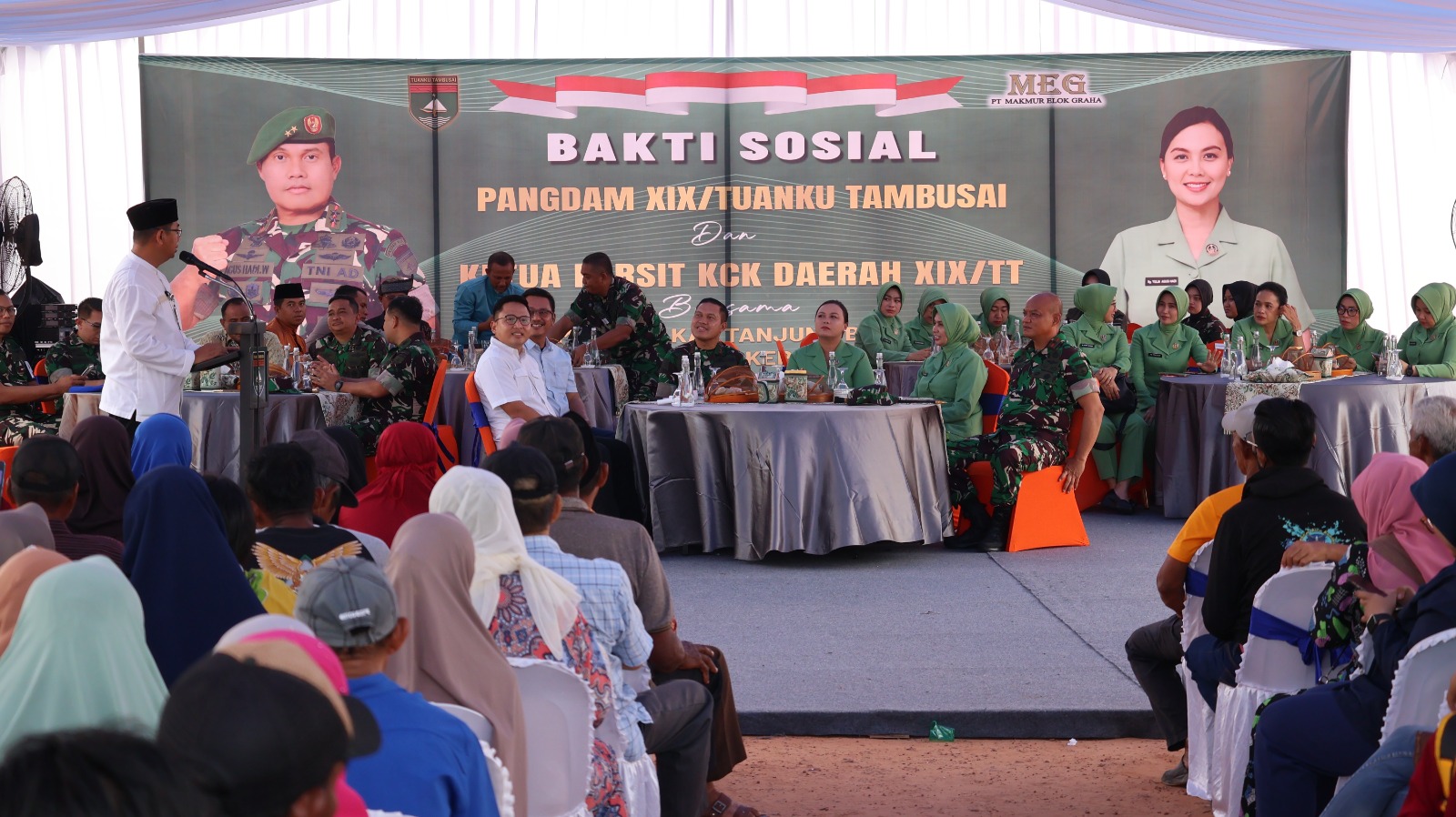 Komandan Korem (Danrem) 033/Wira Pratama, Brigjen TNI Bambang Herqutanto M.Han., mendampingi Pangdam XIX/Tuanku Tambusai, Mayjen TNI Dr. Agus Hadi Waluyo, S.A.P., M.M., CHRMP, bersama Ketua Persit KCK Daerah XIX/TT, Ny. Yulia Agus Hadi Waluyo dan Ketua Persit KCK Koorcab Rem 033 PD XIX/TT, Ny. Cece Bambang Herqutanto, melaksanakan bakti sosial di Perumahan Rempang Eco City, Kampung Tanjung Banon, Kelurahan Sembulang, Kecamatan Galang, Kota Batam, Jumat (24/10/2025).